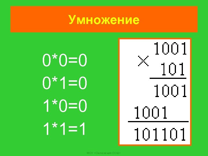 Умножение 0*0=0 0*1=0 1*0=0 1*1=1 МОУ <Селковская СОШ>