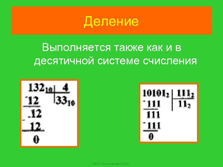 Деление Выполняется также как и в десятичной системе счисления МОУ <Селковская СОШ>