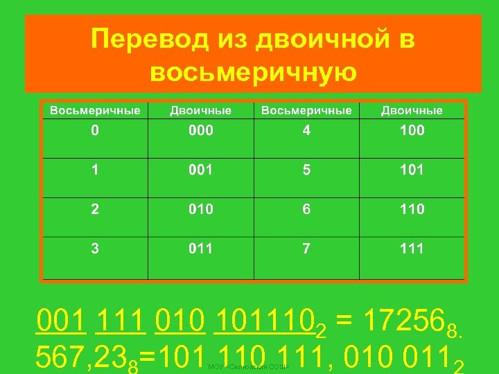 Перевод из двоичной в восьмеричную 001 111 010 1011102 = 172568. 567, 23 =101 110 111, 010 011 МОУ <Селковская СОШ>