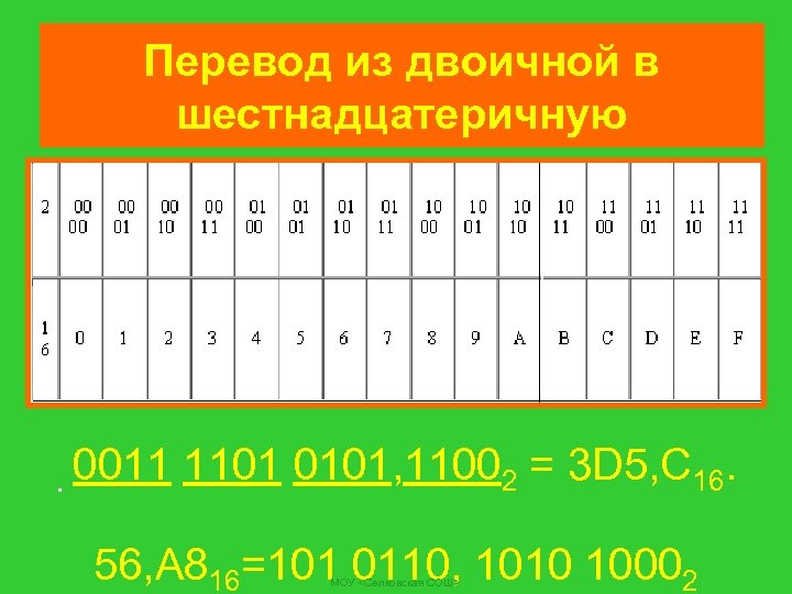 Перевод из двоичной в шестнадцатеричную . 0011 1101 0101, 11002 = 3 D 5, C 16. 56, А 816=101 0110, 1010 10002 МОУ <Селковская СОШ>