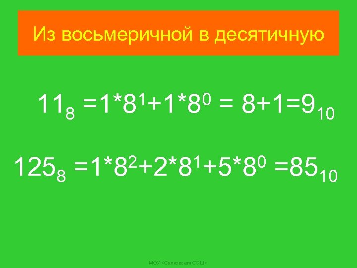 Из восьмеричной в десятичную 118 1258 1+1*80 = 8+1=9 =1*8 10 2+2*81+5*80 =85 =1*8 МОУ <Селковская СОШ> 10
