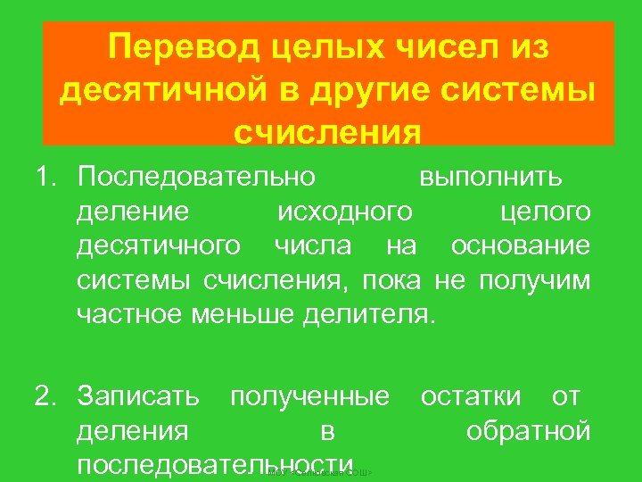 Перевод целых чисел из десятичной в другие системы счисления 1. Последовательно выполнить деление исходного целого десятичного числа на основание системы счисления, пока не получим частное меньше делителя. 2. Записать полученные остатки от деления в обратной последовательности МОУ <Селковская СОШ>