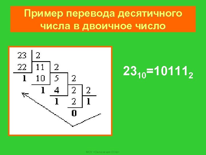 Пример перевода десятичного числа в двоичное число 2310=101112 МОУ <Селковская СОШ>