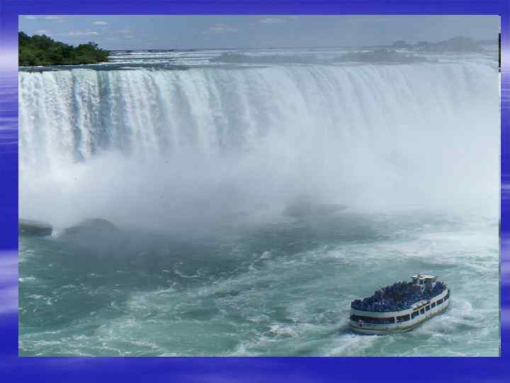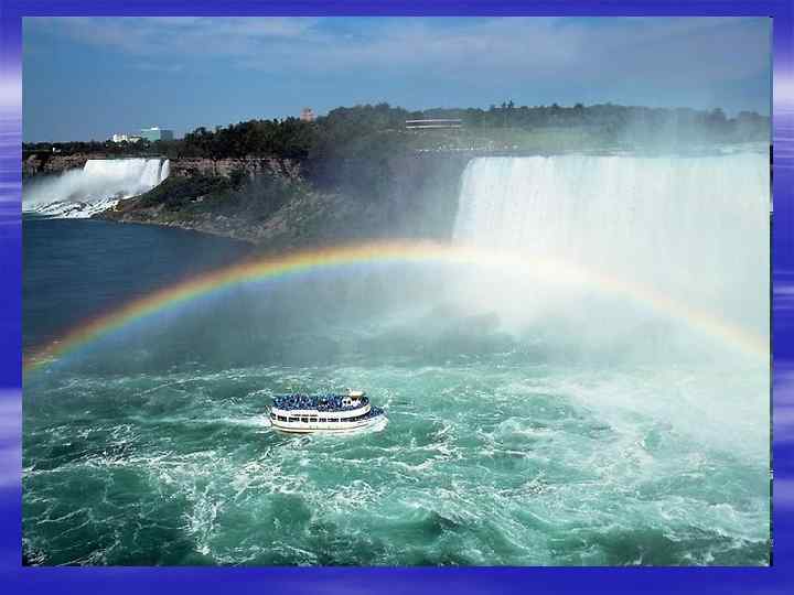 Niagara falls. Niagara falls is the largest waterfall of the world, situated on the border between Niagara, located the border between the U. S. A. and Canada. Drop of Niagara falls is not very big, only 53 meters, however, the volume of water passing throng it, it has no equal in the world. it consists of three waterfalls, "Canadian" (in the form of a horseshoeon satellite image), "The American" (upstream) and the "Veil. " Great success with the tourists enjoy the local entertainment: boat trip to the waterfall. The shipapproached the waterfall can be seen in the picture
