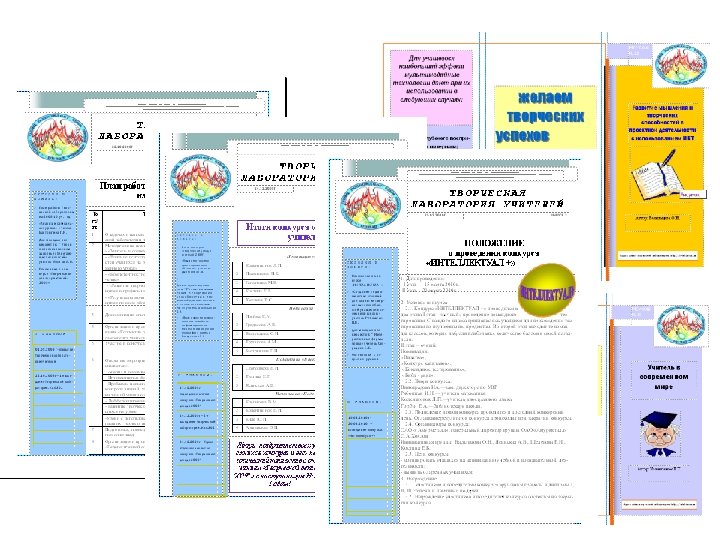 ПЛАН РАБОТЫ ТВОРЧЕСКОЙ ЛАБОРАТОРИИ НА 2011 -2012 УЧ. ГОД. № Тема Дата проведения Ответственные 1 О задачах и направлениях работы творческой лаборатории на 2011 -12 уч. год Сентябрь Виноградова И. А. 2 Методические планерки: - «Учитель в современном мире» 22 октября Колентионок Л. П. - «Влияние психологических особенностей учащихся на результативность современного урока» 19 ноября Кабанова Л. К. - «Компетентностно-ориентированное обучение» 24 декабря Дмитриева Т. В. - «Развитие творческих способностей учащихся в профильной школе» 25 февраля Смирнова Е. Ю. - «Результаты мониторинга развития учащихся по всем областям знаний» 25 марта Виноградова И. А. 3 Диссеминация опыта учителей ПНПО В течение года Виноградова И. А. 4 Организация и проведение микроисследования «Коллектив о коллективе: оценка и самооценка учительского коллектива» Декабрь Члены творческой лаборатории 5 Участие в конкурсах В течение года Члены творческой лаборатории