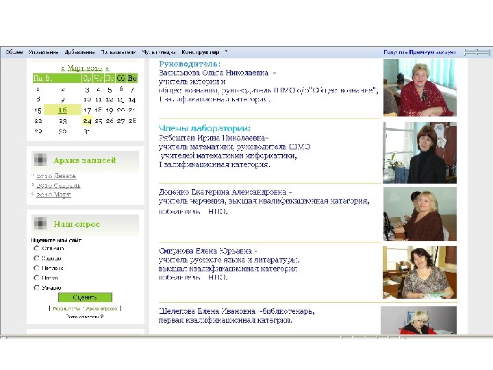 СОСТАВ «ТВОРЧЕСКОЙ ЛАБОРАТОРИИ» • • • Васильцова О. Н. – учитель истории, заместитель директора по УВР» , Шелепова Е. И. , Горбач Е. А. – библиотекари школы, Рябоштан И. Н. – учитель математики, руководитель ШМО учителей математики, Мозгов А. П. – учитель технологии, руководитель ШМО учителей о/о «Технология» , Черкасова И. А. – учитель русского языка и литературы, руководитель ШМО учителей русского языка и литературы, Бастрыгина Г. И. – учитель географии, руководитель ШМО учителей естественнонаучного цикла, Смирнова Е. Ю. – учитель русского языка и литературы, победитель ПНПО; Доценко Е. А. – учитель черчения, победитель ПНПО; Дмитриева Т. В. – учитель информатики, победитель ПНПО; Скуридина Е. Е. –учитель информатики, победитель ПНПО.
