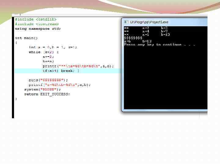 Оператор while(вираз)оператор_або_блок Ні Вираз while(1)y=3; // Нескінченний цикл Так …… int x=5, y=0; while(x>1) {y+=3; x--; } …… int x=5, y=0; while(x<1) {y+=3; x--; } // не виконається ні разу ………. . int і = 0, а = 1, k=1; while (k<2) { і+=2; а+= i; if(i >4) break; } Оператор