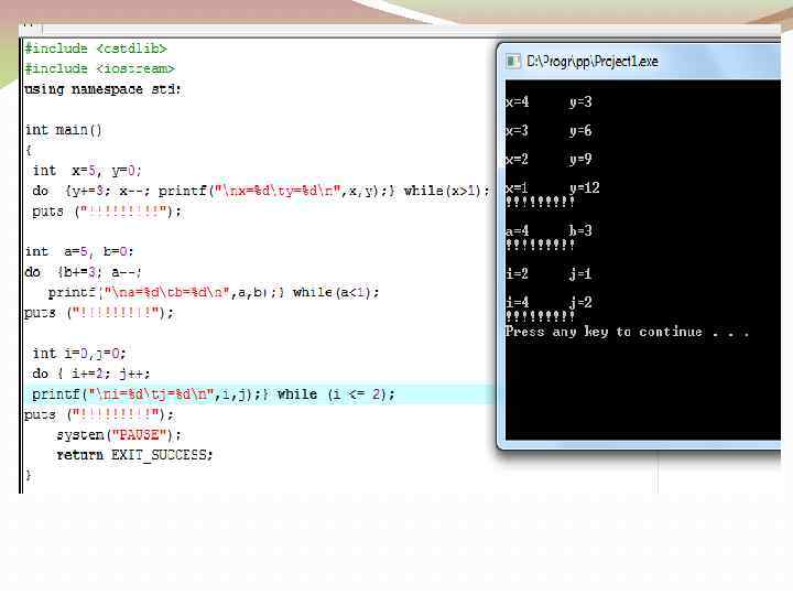 Оператор do-while do оператор_або_блок; while(вираз); Оператор do y=3; while(2); // Нескінченний цикл int x=5, y=0; do {y+=3; x--; } while(x>1) int x=5, y=0; do {y+=3; x--; } while(x<1); // виконається 1 раз ………. . int а =0, і =0; do { а+=2; і++; } while (і <= 2); Ні Вираз Так