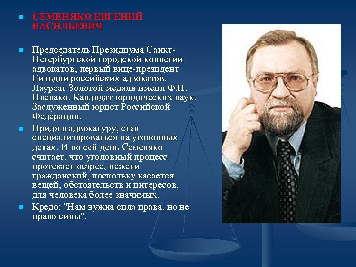 n СЕМЕНЯКО ЕВГЕНИЙ ВАСИЛЬЕВИЧ n Председатель Президиума Санкт. Петербургской городской коллегии адвокатов, первый вице-президент Гильдии российских адвокатов. Лауреат Золотой медали имени Ф. Н. Плевако. Кандидат юридических наук. Заслуженный юрист Российской Федерации. Придя в адвокатуру, стал специализироваться на уголовных делах. И по сей день Семеняко считает, что уголовный процесс протекает острее, нежели гражданский, поскольку касается вещей, обстоятельств и интересов, для человека более значимых. Кредо: "Нам нужна сила права, но не право силы". n n