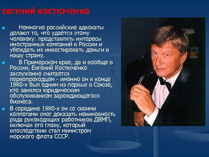 ЕВГЕНИЙ КОСТЮЧЕНКО n n n Немногие российские адвокаты делают то, что удаётся этому человеку: представлять интересы иностранных компаний в России и убеждать их инвестировать деньги в нашу страну. В Приморском крае, да и вообще в России, Евгений Костюченко заслуженно считается первопроходцем - именно он в конце 1980 -х был одним из первых в Союзе, кто занялся юридическим обслуживанием зарождающегося бизнеса. В середине 1980 -х он со своими коллегами смог доказать невиновность ряда руководящих работников ДВМП, включая его главу, который впоследствии стал министром морского флота СССР.
