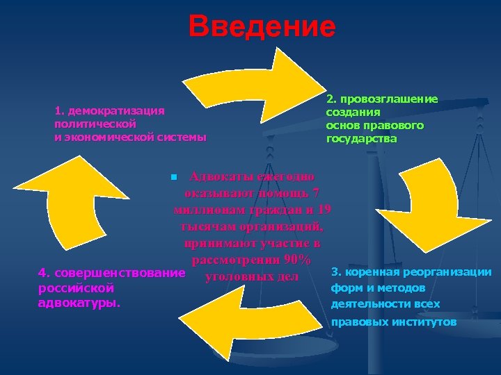 Введение 1. демократизация политической и экономической системы 2. провозглашение создания основ правового государства Адвокаты ежегодно оказывают помощь 7 миллионам граждан и 19 тысячам организаций, принимают участие в рассмотрении 90% 3. коренная реорганизации 4. совершенствование уголовных дел n российской адвокатуры. форм и методов деятельности всех правовых институтов