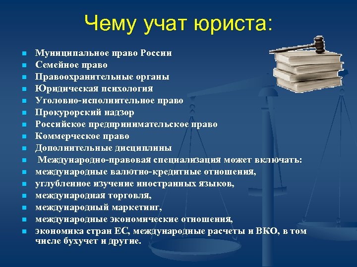Чему учат юриста: n n n n Муниципальное право России Семейное право Правоохранительные органы Юридическая психология Уголовно-исполнительное право Прокурорский надзор Российское предпринимательское право Коммерческое право Дополнительные дисциплины Международно-правовая специализация может включать: международные валютно-кредитные отношения, углубленное изучение иностранных языков, международная торговля, международный маркетинг, международные экономические отношения, экономика стран ЕС, международные расчеты и ВКО, в том числе бухучет и другие.