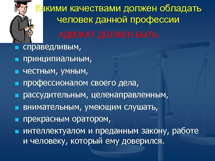 Какими качествами должен обладать человек данной профессии n n n n АДВОКАТ ДОЛЖЕН БЫТЬ: справедливым, принципиальным, честным, умным, профессионалом своего дела, рассудительным, целенаправленным, внимательным, умеющим слушать, прекрасным оратором, интеллектуалом и преданным закону, работе и человеку, который ему доверился.
