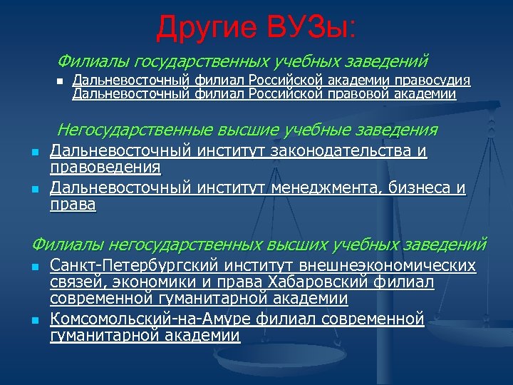 Другие ВУЗы: Филиалы государственных учебных заведений n Дальневосточный филиал Российской академии правосудия Дальневосточный филиал Российской правовой академии Негосударственные высшие учебные заведения n n Дальневосточный институт законодательства и правоведения Дальневосточный институт менеджмента, бизнеса и права Филиалы негосударственных высших учебных заведений n n Санкт-Петербургский институт внешнеэкономических связей, экономики и права Хабаровский филиал современной гуманитарной академии Комсомольский-на-Амуре филиал современной гуманитарной академии