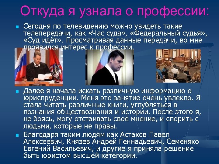 Откуда я узнала о профессии: n n n Сегодня по телевидению можно увидеть такие телепередачи, как «Час суда» , «Федеральный судья» , «Суд идёт» . Просматривая данные передачи, во мне проявился интерес к профессии. Далее я начала искать различную информацию о юриспруденции. Меня это занятие очень увлекло. Я стала читать различные книги, углубляться в познания обществознания и истории. После этого я, не боясь, могу отстаивать своё мнение, и спорить с людьми, которые не правы. Благодаря таким людям как Астахов Павел Алексеевич, Князев Андрей Геннадьевич, Семеняко Евгений Васильевич, и другие я приняла решение быть юристом высшей категории.