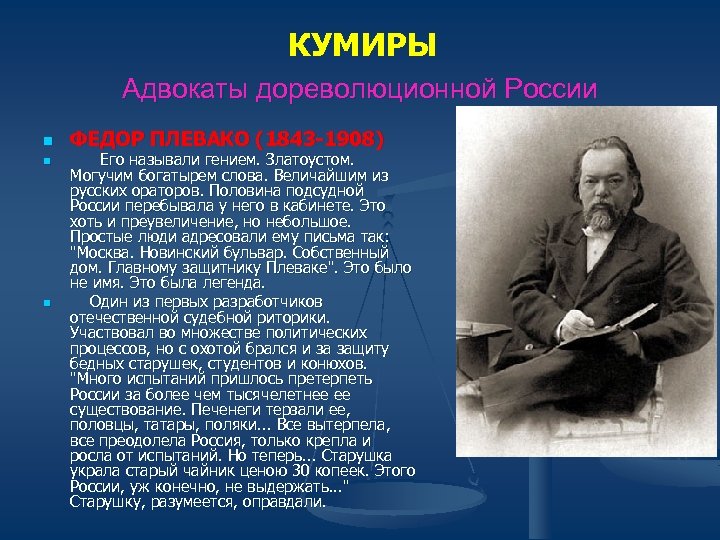 КУМИРЫ Адвокаты дореволюционной России n n n ФЕДОР ПЛЕВАКО (1843 -1908) Его называли гением. Златоустом. Могучим богатырем слова. Величайшим из русских ораторов. Половина подсудной России перебывала у него в кабинете. Это хоть и преувеличение, но небольшое. Простые люди адресовали ему письма так: "Москва. Новинский бульвар. Собственный дом. Главному защитнику Плеваке". Это было не имя. Это была легенда. Один из первых разработчиков отечественной судебной риторики. Участвовал во множестве политических процессов, но с охотой брался и за защиту бедных старушек, студентов и конюхов. "Много испытаний пришлось претерпеть России за более чем тысячелетнее ее существование. Печенеги терзали ее, половцы, татары, поляки. . . Все вытерпела, все преодолела Россия, только крепла и росла от испытаний. Но теперь. . . Старушка украла старый чайник ценою 30 копеек. Этого России, уж конечно, не выдержать. . . " Старушку, разумеется, оправдали.
