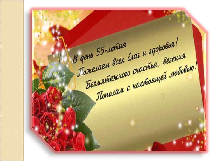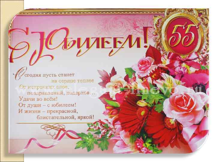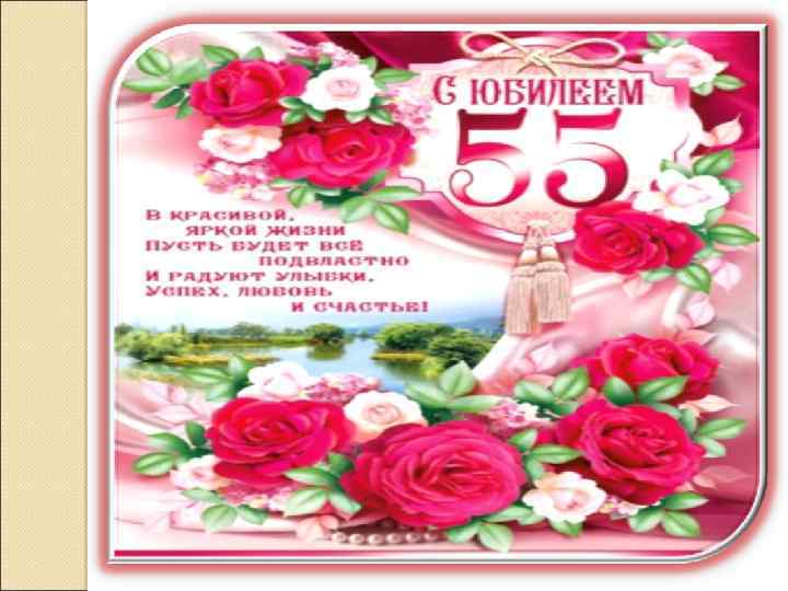 С 55 -летием тебя, Так хочу, чтоб ты была, Все так же хороша, Как твоя чистая душа. Пусть сбываются мечты, Пусть дарят все цветы. Живи и улыбайся, Счастливой быть старайся. С Днем Рождения тебя, Пусть в душе твоей Всегда будет весна. Я люблю тебя!