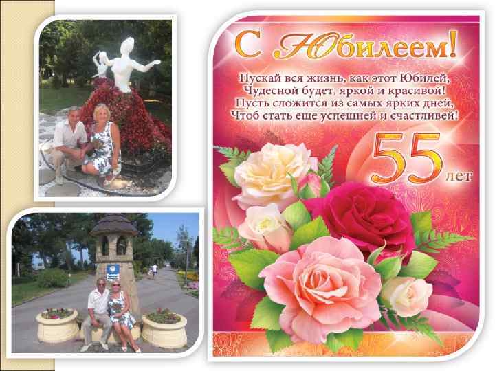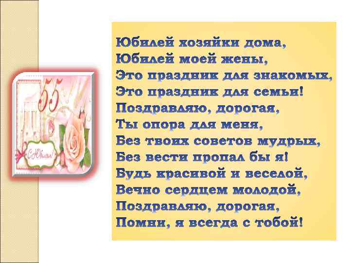 Женушка моя родная, Для меня ты молодая И прекрасная всегда Каждый день, во все года. 55 тебе лет, Столь прекрасный юбилей, Расцвела ты, как цветок, Словно нежный лепесток. Пусть тебе, моя родная, Жизнь со мною будет раем, Ежедневно улыбайся, Жизнью этой наслаждайся.