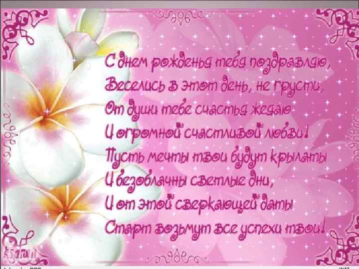 ппооооор Пусть звезды светятся в глазах твоих, Пусть счастье, как шампанское, искрится, Пусть слезы никогда не блещут в них, И в сердце, пусть печаль не постучится. Пусть этот день, как песня соловья, Перечеркнет всех хмурых дней ненастье. Пусть жизнь твоя, как майская заря, Приносит каждый день в ладонях счастье!!!