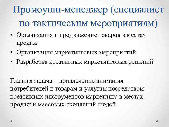 Промоушн-менеджер (специалист по тактическим мероприятиям) • Организация и продвижение товаров в местах продаж • Организация маркетинговых мероприятий • Разработка креативных маркетинговых решений Главная задача – привлечение внимания потребителей к товарам и услугам посредством креативных инструментов маркетинга в местах продаж и массовых скоплений людей.
