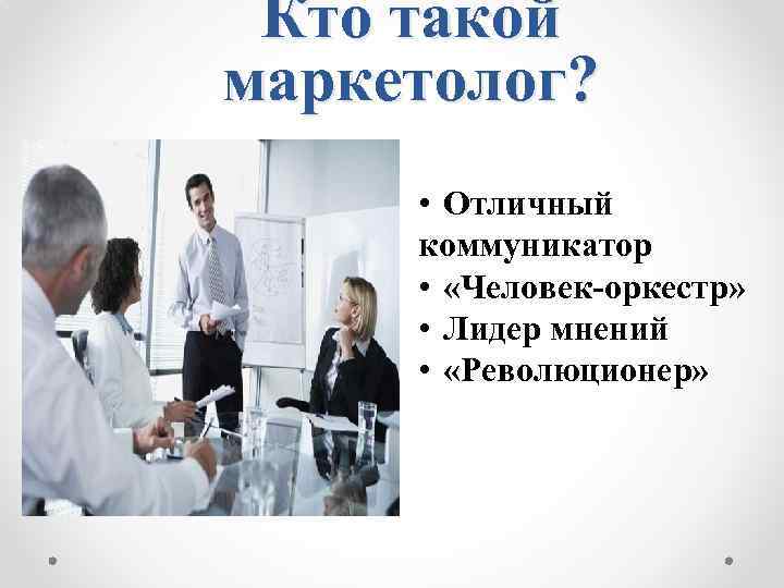 Кто такой маркетолог? • Отличный коммуникатор • «Человек-оркестр» • Лидер мнений • «Революционер»