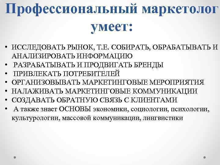 Профессиональный маркетолог умеет: • ИССЛЕДОВАТЬ РЫНОК, Т. Е. СОБИРАТЬ, ОБРАБАТЫВАТЬ И АНАЛИЗИРОВАТЬ ИНФОРМАЦИЮ • РАЗРАБАТЫВАТЬ И ПРОДВИГАТЬ БРЕНДЫ • ПРИВЛЕКАТЬ ПОТРЕБИТЕЛЕЙ • ОРГАНИЗОВЫВАТЬ МАРКЕТИНГОВЫЕ МЕРОПРИЯТИЯ • НАЛАЖИВАТЬ МАРКЕТИНГОВЫЕ КОММУНИКАЦИИ • СОЗДАВАТЬ ОБРАТНУЮ СВЯЗЬ С КЛИЕНТАМИ • А также знает ОСНОВЫ экономики, социологии, психологии, культурологии, массовой коммуникации, лингвистики