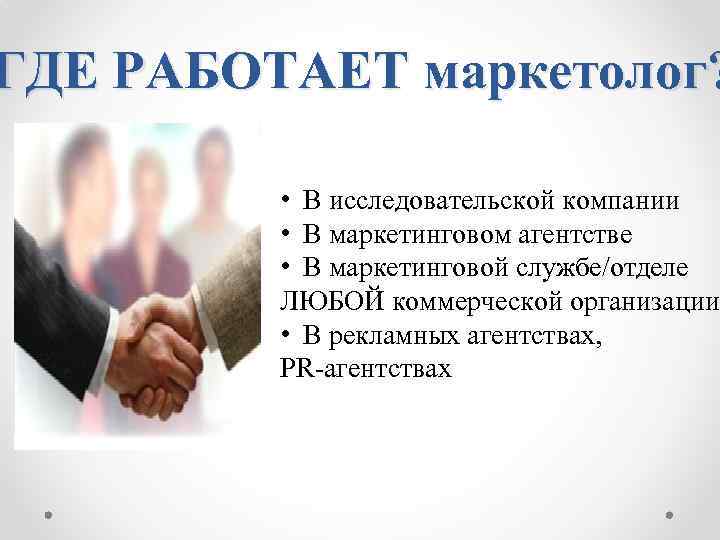 ГДЕ РАБОТАЕТ маркетолог? • В исследовательской компании • В маркетинговом агентстве • В маркетинговой службе/отделе ЛЮБОЙ коммерческой организации • В рекламных агентствах, PR-агентствах
