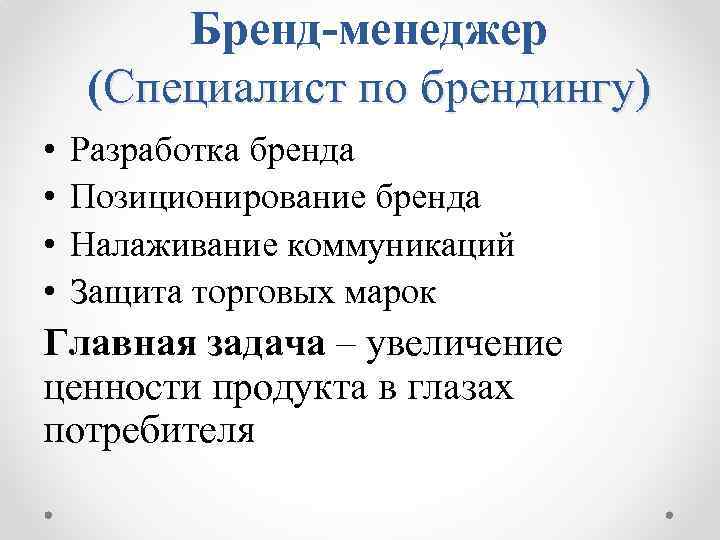 Бренд-менеджер (Специалист по брендингу) • • Разработка бренда Позиционирование бренда Налаживание коммуникаций Защита торговых марок Главная задача – увеличение ценности продукта в глазах потребителя