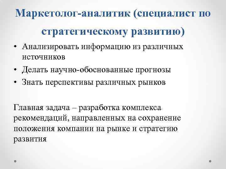 Маркетолог-аналитик (специалист по стратегическому развитию) • Анализировать информацию из различных источников • Делать научно-обоснованные прогнозы • Знать перспективы различных рынков Главная задача – разработка комплекса рекомендаций, направленных на сохранение положения компании на рынке и стратегию развития