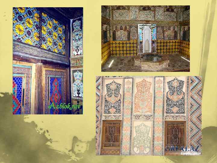 Ислам Мозаика очень широко использовалась в оформлении дворцов правителей Востока. Дворец шекинских ханов является выдающимся произведением средневековой архитектуры Азербайджана. Если не было бы других древних сооружений Азербайджана, то было бы достаточным показать всему миру только Дворец шекинских ханов, считающийся одним из ценных памятников архитектуры XVIII века Азербайджана был построен в 1762 году Гусейханом. Дворец, в свое время входивший в комплекс дворцовых сооружений и служивший резиденцией шекинских ханов, представляет собой двухэтажное здание. Фасад дворца представляет собой подъемные решетчатые рамы с набором шебеке — разноветными мелкими стеклами. Многоцветный рисунок шебеке красочно дополняет росписи, покрывающие стены дворца. Во второй половине XVIII века в Шекинском ханстве высокого развития достигло искусство живописи, непосредственно связанной с архитектурой и строительством. Все значительные архитектурные сооружения в городе Шеки были богато украшены стенной росписью, являющейся в то время самым популярным видом живописной техники. Свидетельством тому являются образцы живописи из дворца шекиских ханов, сохранившиеся до наших дней и не утратившего своей художественной выразительности. Стенные росписи посвящались различным темам: сцены охоты на диких зверей, сражений, растительные и геометрические орнаменты, рисунки, созданные по мотивам «Хамсе» (Пятерицы), гениального азербайджанского поэта Низами Гянджеви, сцены из дворцовой жизни, бытовые зарисовки из крестьянской жизни и т. д. В основном применялись такие цвета, как синий, красный, золотистый, желтый. На плафоне зала во дворце шекинских ханов зашифровано имя талантливого живописца Аббаса Кули. Следует отметить, что стены дворца не раз реставрировались, и поэтому здесь можно встретить росписи, сделанные мастерами, жившими в разное время.