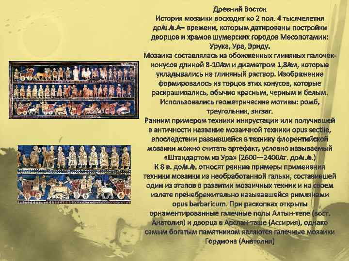 Античность Первые античные мозаики из необработанной гальки найдены в Коринфе и датированы кон. 5 в. до н. э. Это контурные изображения людей, животных, мифологических существ, декорированные геометрическим и растительным орнаментом, выполненные обычно белым по черному, стилистически близкие краснофигурной вазописи. Подобные образцы 4 в. до н. э. найдены также в Олинфе, Сикионе, Эретрии. Важный шаг к реалистичности был сделан в мозаиках Пеллы (кон. 4 в. до н. э. ) Расцвет античной мозаики приходится на эпоху эллинизма, когда появляется техника подколки камешков и становится доступным цветное стекло, что позволяло достигать живописной реалистичности изображений и использовать практически неограниченную цветовую гамму. Древнейшим памятником, где была использована техника подколки или тесселирования, считаются мозаики сицилийского города Моргантина (3 в. до н. э. ). В Древнем Риме мозаикой выкладывались полы и стены вилл, дворцов и терм. Римская мозаика делалась из маленьких кубиков очень плотного стекла — смальты, однако нередким было использование мелких камешков и гальки. Помпеи, «Битва при Иссе» — Мозаика выложена из около полутора миллионов кусочков, собранных в картину по технике, известной как «opus vermiculatum» , то есть кусочки собирались один к одному по извилистым линиям.