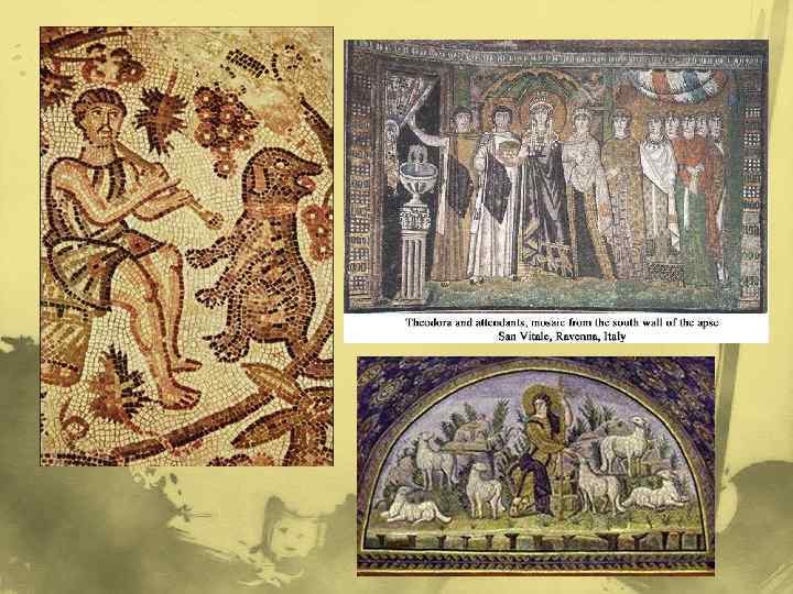 Ранние христиане и Византия Высочайшим расцветом мозаического искусства можно считать эпоху Византийской империи. Византийская мозаика становится более утончённой, используется более мелкий модуль камней и деликатная кладка, фон изображений становится по преимуществу золотым. Равенна Монреале