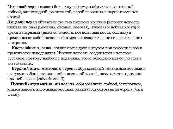 Мозговой череп имеет яйцевидную форму и образован затылочной, лобной, клиновидной, решетчатой, парой височных и парой теменных костей. Лицевой череп образован шестью парными костями (верхняя челюсть, нижняя носовая раковина, слезная, носовая, скуловая и небная кости) и тремя непарными (нижняя челюсть, подъязычная кость, сошник) и представляет собой начальный отдел пищеварительного и дыхательного аппаратов. Кости обоих черепов соединяются друг с другом при помощи швов и практически неподвижны. Нижняя челюсть соединяется с черепом суставом, поэтому наиболее подвижна, что необходимо для ее участия в акте жевания. Верхний отдел мозгового черепа, образованный теменными костями и чешуями лобной, затылочной и височной костей, называется сводом или крышей черепа (calvaria cranii). Нижний отдел мозгового черепа, образованный лобной, затылочной, клиновидной и височными костями, называется основанием черепа (basis cranii).