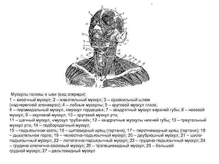 Мускулы головы и шеи (вид спереди): 1 – височный мускул; 2 – жевательный мускул; 3 – сухожильный шлем (надчерепной апоневроз); 4 – лобные мускулы; 5 – круговой мускул глаза; 6 – пирамидальный мускул, «мускул гордецов» ; 7 – квадратный мускул верхней губы; 8 – носовой мускул; 9 – скуловой мускул; 10 – круговой мускул рта; 11 – щечный мускул, «мускул трубачей» ; 12 – квадратные мускулы нижней губы; 13 – треугольный мускул рта; 14 – подбородочный мускул; 15 – подъязычная кость; 16 – щитовидный хрящ (гортани); 17 – перстневидный хрящ (гортани); 18 – дыхательное горло; 19 – челюстно-подъязычный мускул; 20 – двубрюшный мускул; 21 – шило- подъязычный мускул; 22 – лопаточно-подъязычный мускул; 23 – грудино-подъязычный мускул; 24 – грудино-ключично-сосковый мускул; 25 – трапециевидный мускул; 26 – большой грудной мускул; 27 – дельтовидный мускул