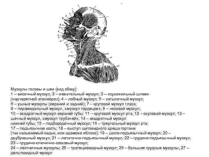 Мускулы головы и шеи (вид сбоку): 1 – височный мускул; 2 – жевательный мускул; 3 – «сухожильный шлем» (надчерепной апоневроз); 4 – лобный мускул; 5 – затылочный мускул; 6 – ушные мускулы (верхний и задний); 7 – круговой мускул глаза; 8 – пирамидальный мускул, «мускул гордецов» ; 9 – носовой мускул; 10 – квадратный мускул верхней губы; 11 – круговой мускул рта; 12 – скуловой мускул; 13 – щечный мускул, «мускул трубачей» ; 14 – квадратный мускул нижней губы; 15 – подбородочный мускул; 16 – треугольный мускул рта; 17 – подъязычная кость; 18 – выступ щитовидного хряща гортани (так называемый кадык, или адамово яблоко); 19 – шило-подъязычный мускул; 20 – двубрюшный мускул; 21 – лопаточно-подъязычный мускул; 22 – грудино-подъязычный мускул; 23 – грудино-ключично-сосковый мускул; 24 – лестничные мускулы; 25 – трапециевидный мускул; 26 – большие грудные мускулы; 27 – дельтовидный мускул