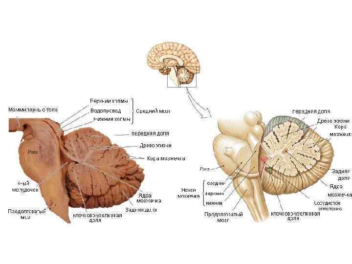 • Мозжечок (cerebellum) располагается в задней черепной ямке, сзади продолговатого мозга и моста, над IV желудочком, под затылочными долями большого мозга