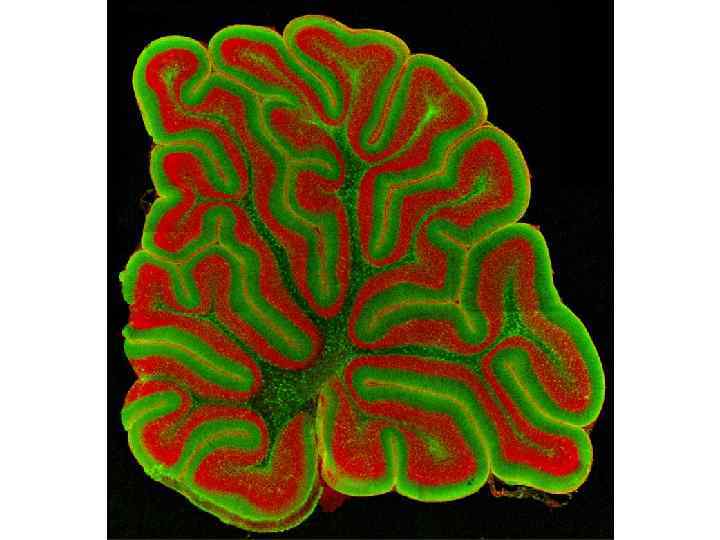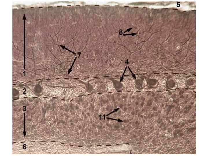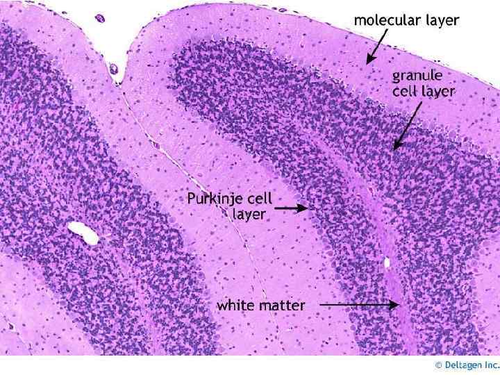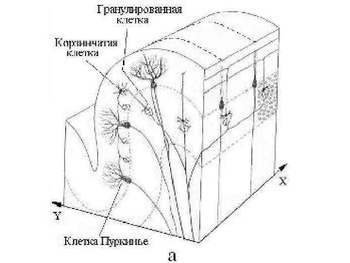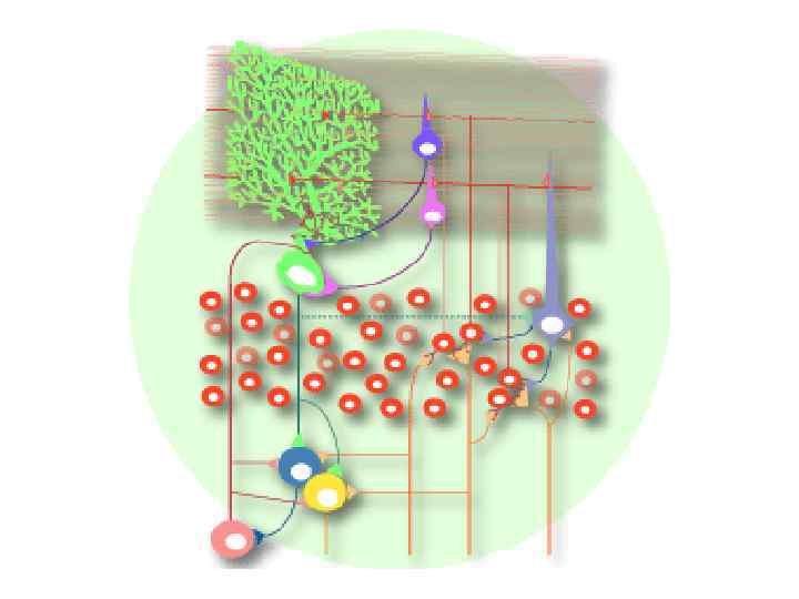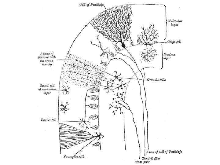 Поверхность полушарий мозжечка покрыта слоем серого вещества—корой • В ней различают три слоя: 1) зернистый, непосредственно прилегающий к белому веществу и состоящий из густо расположенных мелких клеток с короткими дендритами и длинными аксонами, заканчивающимися в молекулярном слое; здесь имеются типичные клетки (Гольджи) с сильно ветвящимися (сразу после отхождения от тела клетки) аксонами; • 2) ганглионарный, состоящий только из одного ряда ганглиозных клеток (Пуркинье), аксоны которых, пройдя зернистый слой, оканчиваются в зубчатом ядре и других ядрах мозжечка; обильно ветвящиеся дендриты клеток Пуркинье оканчиваются в молекулярном слое; • 3) молекулярный с характерными корзинчатыми клетками, аксоны которых своими многочисленными концевыми разветвлениями достигают отростков клеток Пуркинье