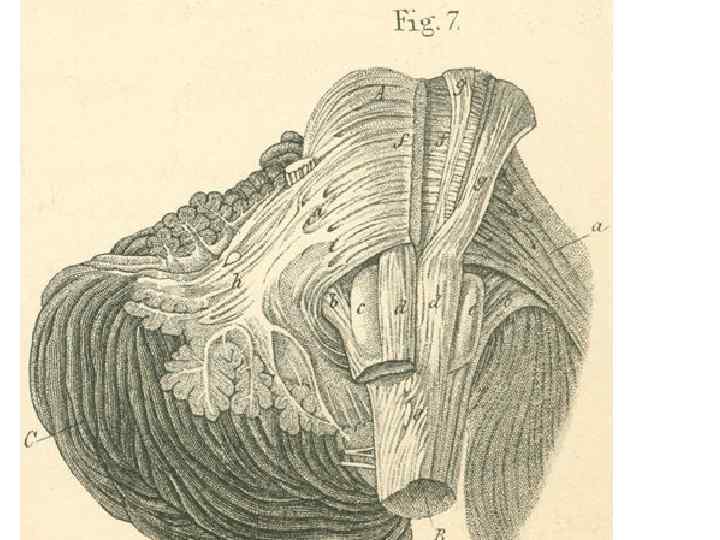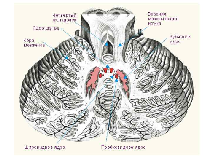 Ядра мозжечка • В белом веществе каждого полушария мозжечка имеются парные ядра. • Самым древним из них является ядро шатра, непосредственно связанное с вестибулярными ядрами ствола мозга и имеющее прямое отношение к равновесию. • Латеральнее находятся шаровидное и пробковидное ядра, которые также относятся к древним образованиям, имеющим отношение к движениям туловища; • наиболее крайнее положение занимает зубчатое ядро, филогенетически более молодое образование, имеющее отношение к движениям конечностей.