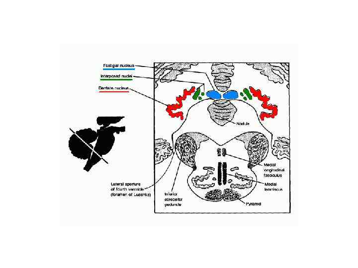 Главные эфференты мозжечка К вестибулярным ядрам ствола мозга К таламусу, а оттуда к коре б. п. К красному ядру К ретикулярной формации Главные афференты мозжечка Задний и передний спинно-мозж. тр. Вестибуло-мозжечковый тракт Оливо-мозжечковый тракт Ретикуло-мозжечковый тракт Мосто-мозжечковый тракт (средние ножки м. ) а