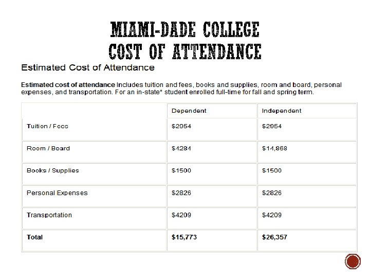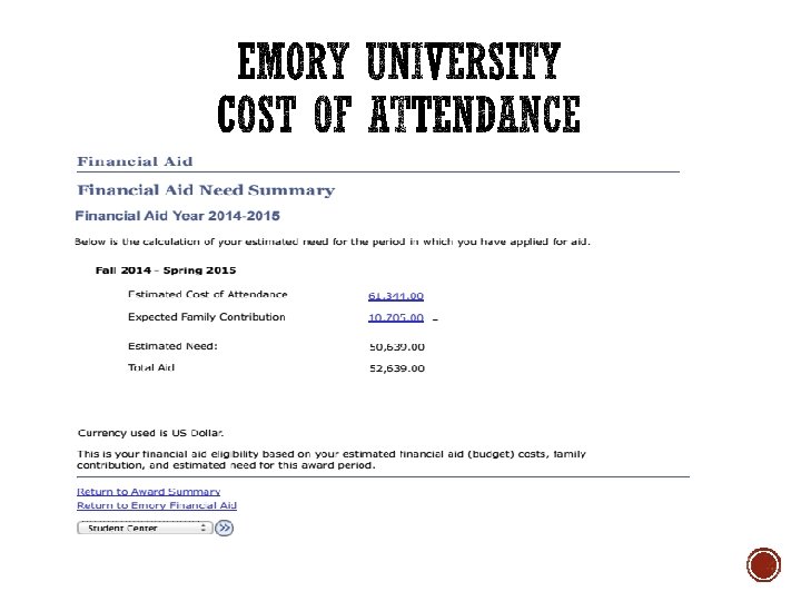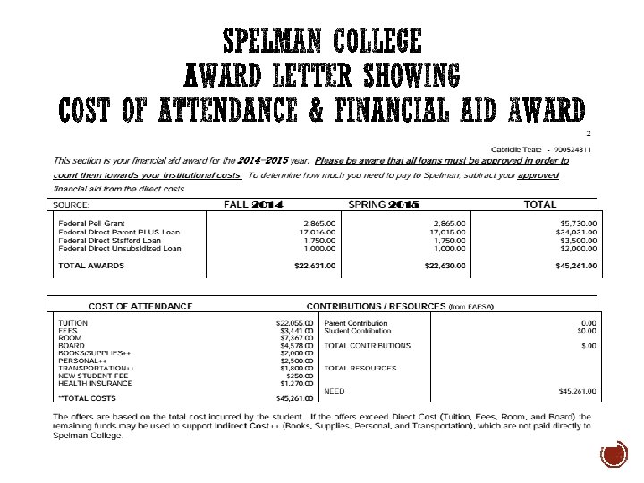 § COA includes: § Tuition and fees (varies depending on credit hours taken) § Books and supplies (varies by cost of books) § Room and board (varies by type of room and meal plan desired) § Transportation (fly, or drive) § Personal expenses (clothing, entertainment, food) TIP COA may be referred to as “direct costs, ” “student budget, ” or “student expenses. ”
