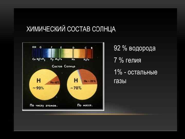 Состав фотосферы: Водород 73, 46% Гелий 24, 85% Кислород 0, 77% Углерод 0, 29% Железо 0, 16% Сера 0, 12% Неон 0, 12% Азот 0, 09% Кремний 0, 07% Магний 0, 05%