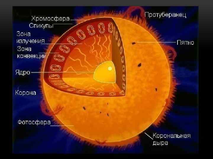 В центре Солнца находится солнечное ядро. Фотосфера – это видимая поверхность Солнца, которая и является основным источником излучения. Солнце окружает солнечная корона, которая имеет очень высокую температуру, однако она крайне разрежена, поэтому видима невооружённым глазом только в периоды полного солнечного затмения.