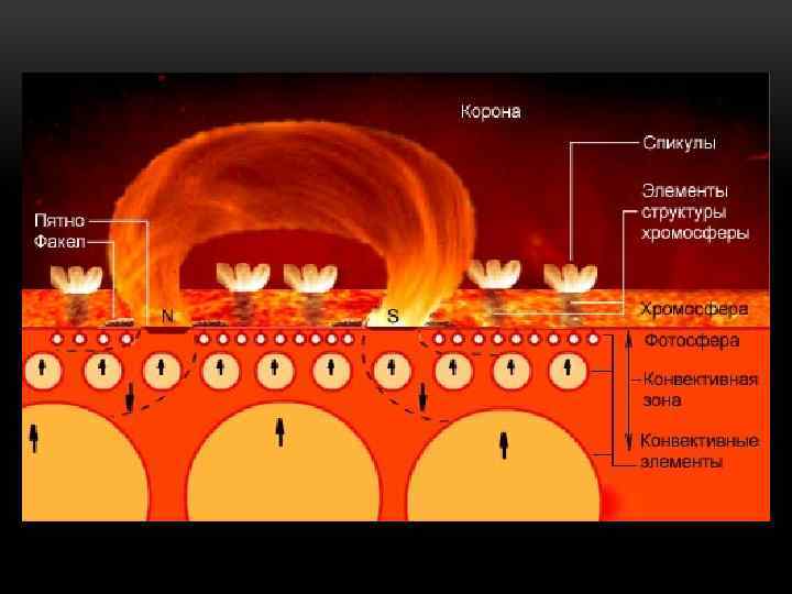 Конвективная зона Солнца. Ближе к поверхности Солнца возникает вихревое перемешивание плазмы, и перенос энергии к поверхности совершается преимущественно движениями самого вещества. Такой способ передачи энергии называется конвекцией, а подповерхностный слой Солнца, толщиной примерно 200 000 км, где она происходит – конвективной зоной. По современным данным, её роль в физике солнечных процессов исключительно велика, так как именно в ней зарождаются разнообразные движения солнечного вещества и магнитные поля.
