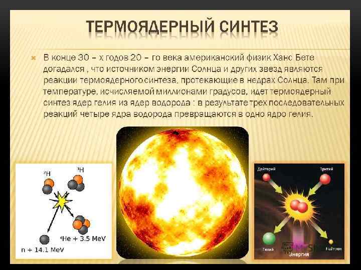Теория термоядерного синтеза была развита в 1930 -х годах астрофизиками Чандрасекаром и Гансом Бете детально рассчитал две главные термоядерные реакции, которые являются источниками энергии Солнца. Наконец, в 1957 г. появилась работа Маргарет Бёрбридж «Синтез элементов в звёздах» , в которой было показано, высказано предположение, что большинство элементов во Вселенной возникло в результате нуклеосинтеза, идущего в звёздах.