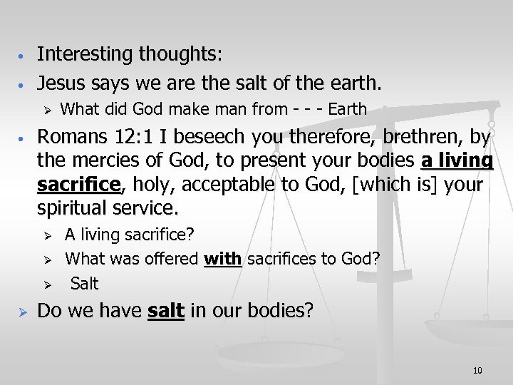 • • Interesting thoughts: Jesus says we are the salt of the earth. Ø • Romans 12: 1 I beseech you therefore, brethren, by the mercies of God, to present your bodies a living sacrifice, holy, acceptable to God, [which is] your spiritual service. Ø Ø What did God make man from - - - Earth A living sacrifice? What was offered with sacrifices to God? Salt Do we have salt in our bodies? 10