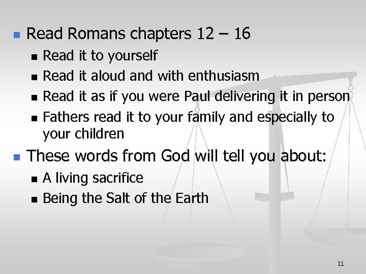 n Read Romans chapters 12 – 16 Read it to yourself n Read it aloud and with enthusiasm n Read it as if you were Paul delivering it in person n Fathers read it to your family and especially to your children n n These words from God will tell you about: A living sacrifice n Being the Salt of the Earth n 11