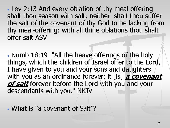Lev 2: 13 And every oblation of thy meal offering shalt thou season with salt; neither shalt thou suffer the salt of the covenant of thy God to be lacking from thy meal-offering: with all thine oblations thou shalt offer salt ASV • Numb 18: 19 "All the heave offerings of the holy things, which the children of Israel offer to the Lord, I have given to you and your sons and daughters with you as an ordinance forever; it [is] a covenant of salt forever before the Lord with you and your descendants with you. " NKJV • • What is “a covenant of Salt”? 2