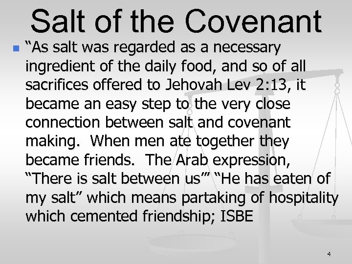 Salt of the Covenant n “As salt was regarded as a necessary ingredient of the daily food, and so of all sacrifices offered to Jehovah Lev 2: 13, it became an easy step to the very close connection between salt and covenant making. When men ate together they became friends. The Arab expression, “There is salt between us”’ “He has eaten of my salt” which means partaking of hospitality which cemented friendship; ISBE 4