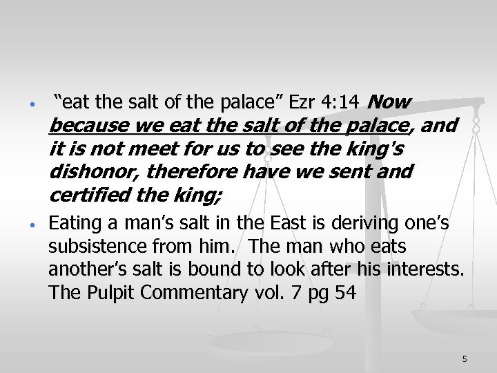 • • “eat the salt of the palace” Ezr 4: 14 Now because we eat the salt of the palace, and it is not meet for us to see the king's dishonor, therefore have we sent and certified the king; Eating a man’s salt in the East is deriving one’s subsistence from him. The man who eats another’s salt is bound to look after his interests. The Pulpit Commentary vol. 7 pg 54 5
