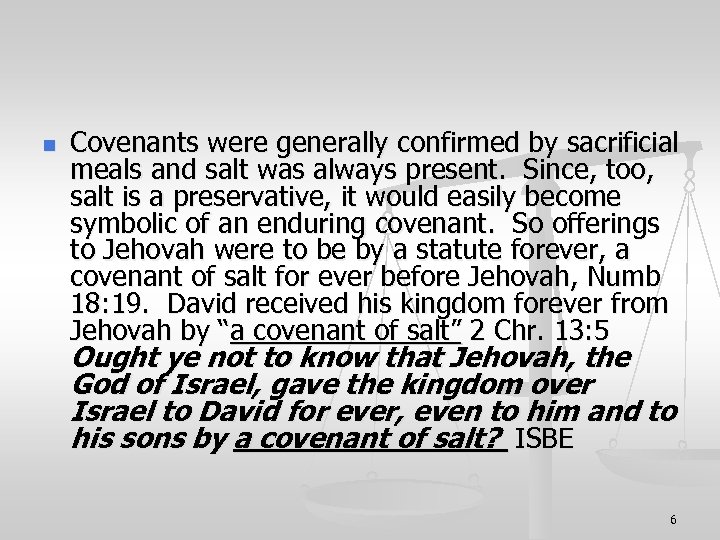 n Covenants were generally confirmed by sacrificial meals and salt was always present. Since, too, salt is a preservative, it would easily become symbolic of an enduring covenant. So offerings to Jehovah were to be by a statute forever, a covenant of salt for ever before Jehovah, Numb 18: 19. David received his kingdom forever from Jehovah by “a covenant of salt” 2 Chr. 13: 5 Ought ye not to know that Jehovah, the God of Israel, gave the kingdom over Israel to David for ever, even to him and to his sons by a covenant of salt? ISBE 6